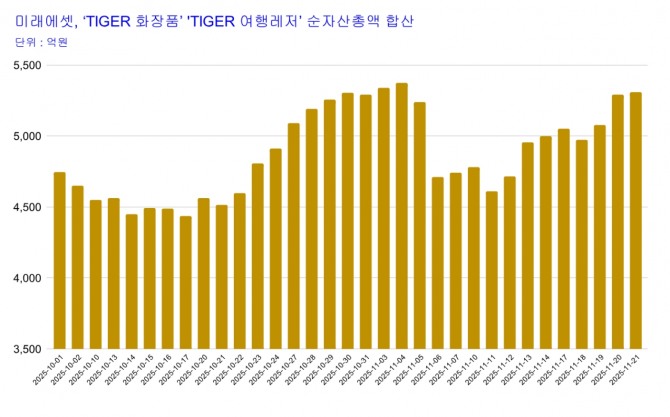 이미지 확대보기24일 글로벌이코노믹이 집계한 바에 따르면, 21일 기준 'TIGER 화장품 ETF'의 순자산은 4216억원이고, 'TIGER 여행레저 ETF'의 순자산은 1092억원으로 합산 순자산총액은 5308억이다.