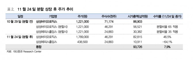 이미지 확대보기지난 24일 삼성바이오로직스와 삼성에피스홀딩스가 분할 후 코스피에 재상장을 완료했다. 재상장일 기준 기업가치는 삼성바이오로직스 82조8000억원(+46.5%), 에피스홀딩스 10조9000억원(-64.1%)이며, 합산 시가총액은 93조7000억원으로 분할 전(86조9000억원) 대비 7.9% 증가했다.