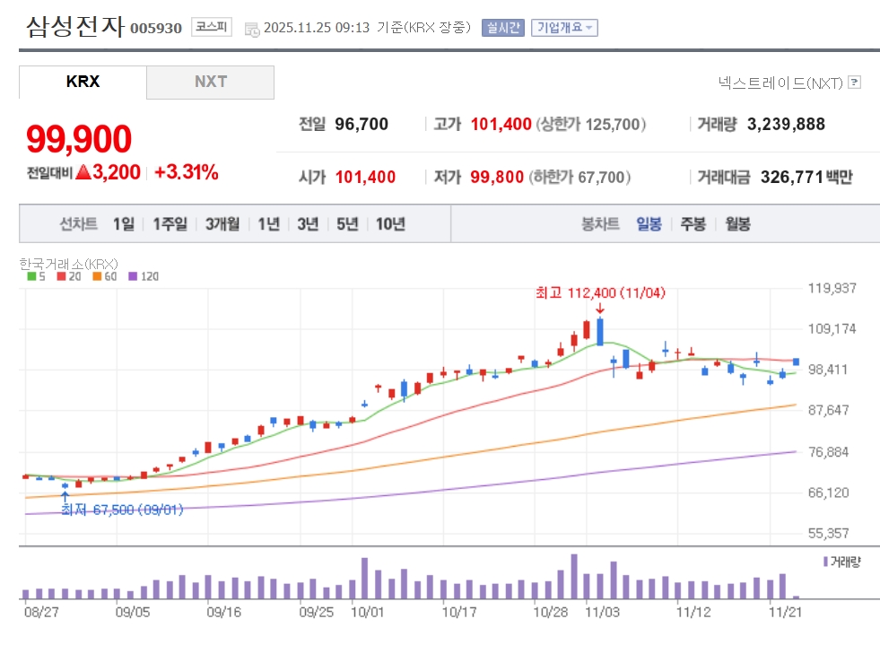 이미지 확대보기25일 한국거래소에 따르면 오전 9시 13분 기준 삼성전자는 전 거래일 대비 3.31% 오른 9만9900원에 거래되고 있다. SK하이닉스는 5.19% 상승한 54만 7000원에 거래 중이다.