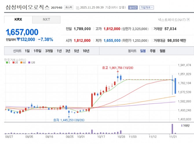 삼성바이오로직스 주가 추이. 자료=네이버페이 증권이미지 확대보기