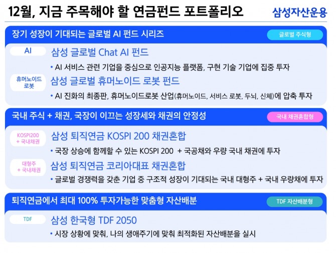 삼성자산운용 전용우 연금OCIO본부장은 "연금은 장기 레이스인 만큼 유행을 좇기보다 구조적 성장 자산과 안정 자산을 균형 있게 담는 것이 중요하다"며 "AI·로봇 같은 미래 성장 테마를 중심에 두고 채권혼합형으로 변동성을 조절하면 세액공제와 노후 대비를 모두 잡을 수 있을 것"이라고 말했다.