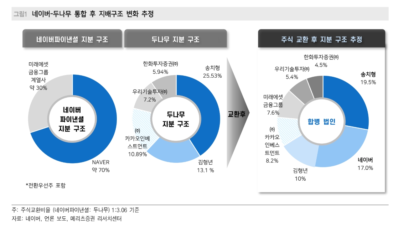 이미지 확대보기네이버는 합병 후 네이버파이낸셜 지분 17%를 확보하게 된다. 여기에 송치형 두나무 회장(19.5%), 김형년 부회장(10%)의 의결권 위임분을 더해 총 46.5%의 지배력을 갖출 전망이다. 이 연구원은 “NAVER 약 70%, 미래에셋금융그룹 계열사 약 30%로 지배구조가 재편될 것”이라고 짚었다.