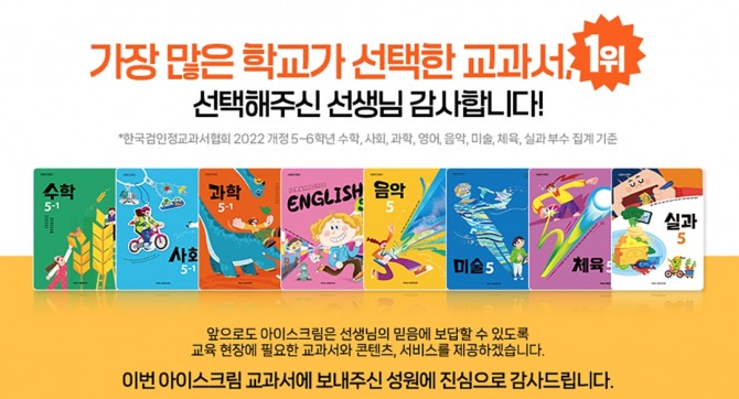 협회가 집계한 3~6학년(수학·사회·과학·영어·음악·미술·체육·실과) 교과서 총 주문량 기준으로 산출됐으며, 아이스크림미디어가 전체 출판사 중 가장 높은 점유율을 기록한 것으로 나타났다.