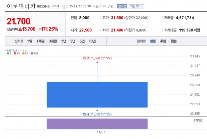 이미지 확대보기27일 한국거래소에 따르면 오전 9시30분 현재 아로마티카는 코스닥 시장에서 공모가(8000원) 대비 171.25% 오른 2만1700원에 거래 중이다. 개장 직후엔 293.75% 뛴 3만1500원을 터치하기도 했다.