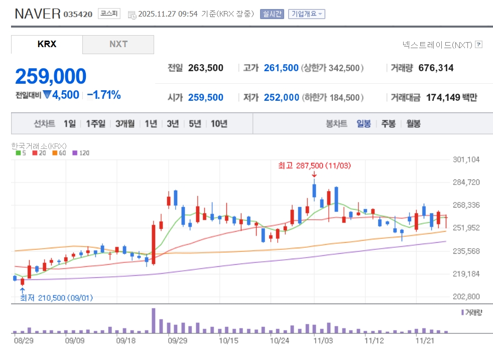 이미지 확대보기27일 한국거래소에 따르면 이날 오전 9시54분 현재 네이버는 전거래일 대비 1.71% 내린 25만 9000원에 거래 중이다.