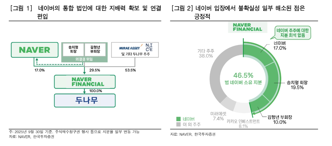 정호윤 한국투자증권 연구원은 "가장 큰 불확실성이었던 기업가치 비율이 네이버에게 나쁘지 않게 산정됨으로써 투자자들 입장에서 하나의 리스크는 해소됐다"며 "그러나 여전히 두나무 주주들의 주식매수청구권행사 규모, 공정위 및 금융위원회 등의 승인 여부라는 불확실성은 상존해 있다"고 짚었다.