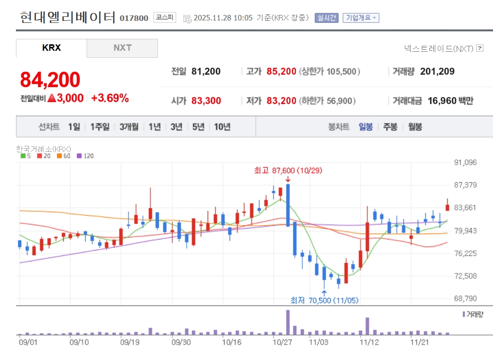 이미지 확대보기28일 한국거래소에 따르면 오전 10시 5분 기준 현대엘리베이터는 전일 대비 3.69% 오른 8만4200원에 거래되고 있다.