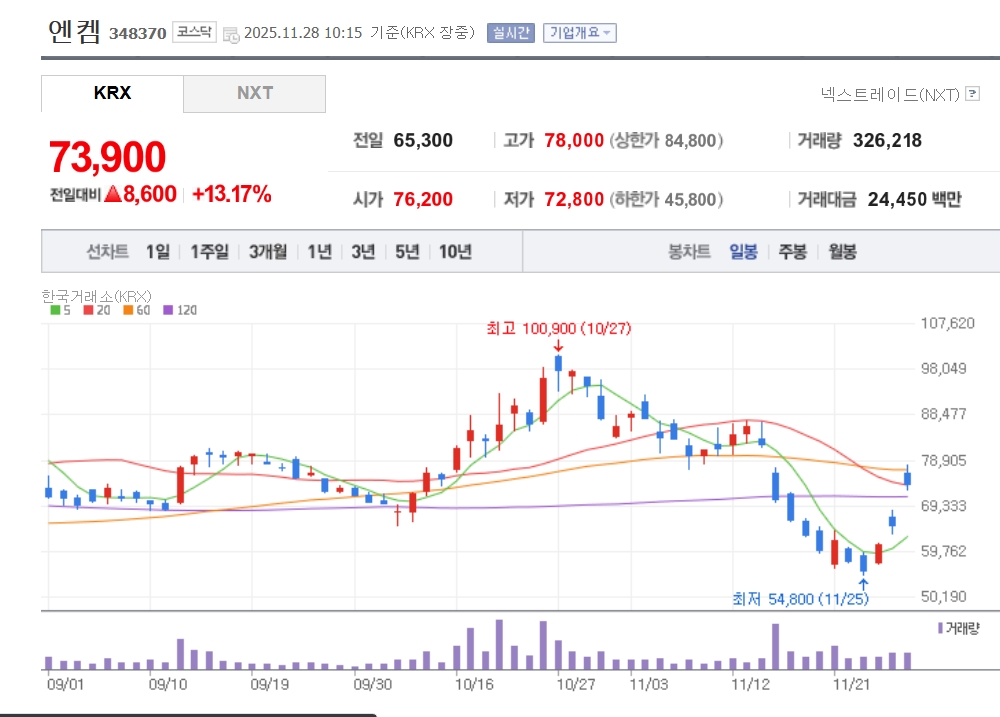 이미지 확대보기28일 한국거래소에 따르면, 엔켐은 오전 10시 15분 기준으로 전 거래일 대비 13.17% 오른 7만 3900원에 거래되고 있다.