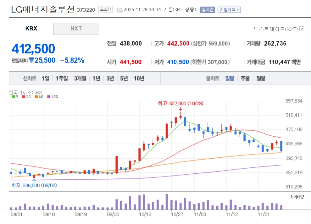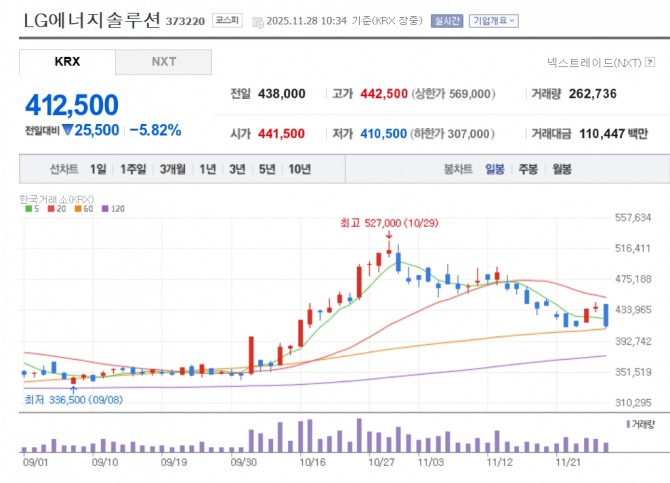 이미지 확대보기28일 한국거래소에 따르면 오전 10시 34분 기준 LG에너지솔루션은 유가증권시장에서 전 거래일 대비 5.82% 내린 41만2500원에 거래되고 있다.
