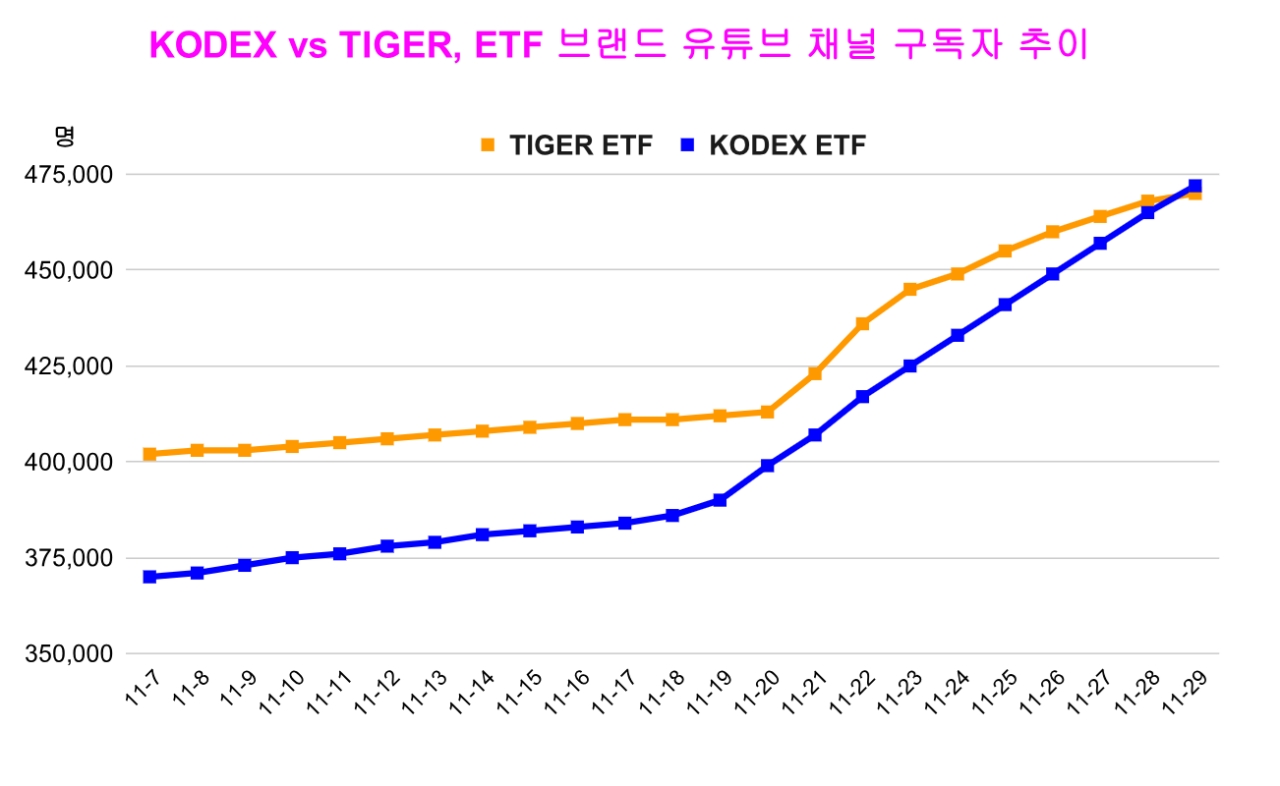 구독자 수 기준 첫 역전은 11월 29일 기록됐다. 앞서 28일까지는 TIGER가 46만8000명으로 KODEX(46만5000명)를 근소하게 앞섰지만, 다음 날 KODEX가 47만2000명을 기록하며 TIGER(47만 명)를 2000명 차이로 추월했다.