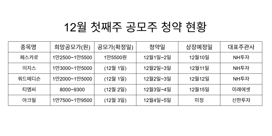 30일 금융투자업계에 따르면 12월 1~5일 사이 페스카로, 이지스, 쿼드메디슨, 티엠씨, 아크릴 등 5개 기업이 일반 청약에 돌입한다. 일정이 미뤄졌던 삼진식품과 리브스메드도 같은 기간 수요예측을 시작하며 다음 주 청약을 준비한다.