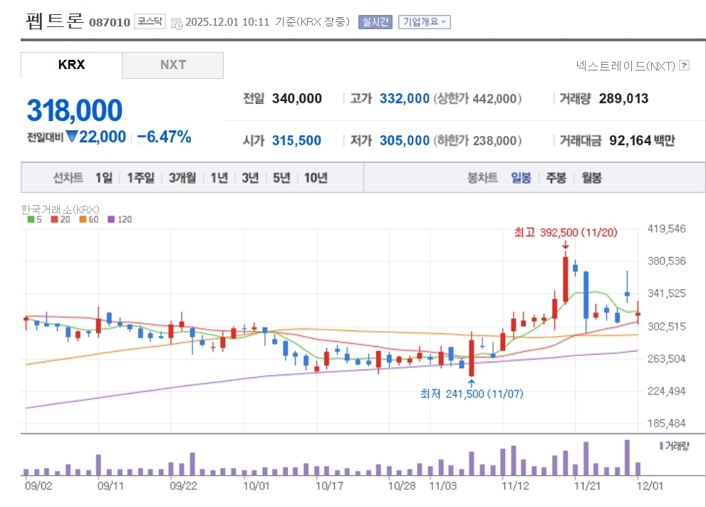 이미지 확대보기1일 한국거래소에 따르면 오전 10시 11분 현재 펩트론은 전장 대비 6.47% 내린 31만8000원에 거래 중이다.