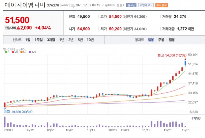 이미지 확대보기2일 한국거래소에 따르면 오전 9시 19분 기준 에이치이엠파마는 전일 대비 4.04% 급등한 5만1500원에 거래되고 있다. 한때 5만4500원까지 오르며 52주 신고가를 터치했다.
