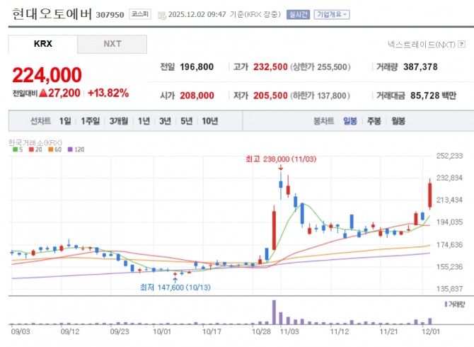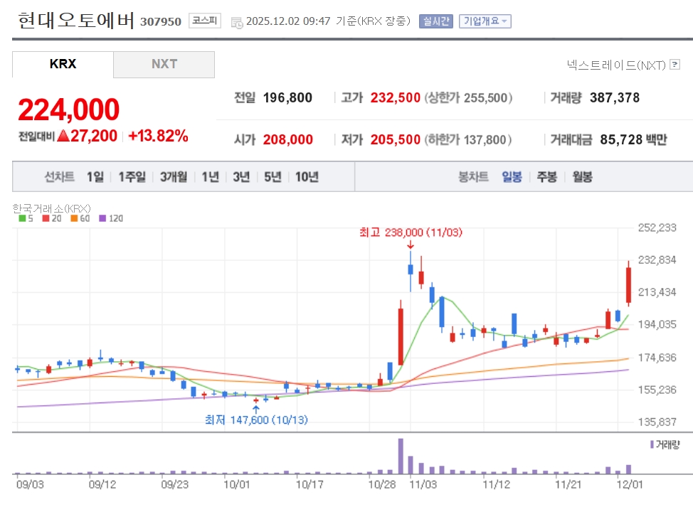 이미지 확대보기2일 한국거래소에 따르면 오전 9시 47분 기준 현대오토에버는 유가증권시장에서 전 거래일 대비 13.82% 오른 22만4000원에 거래되고 있다.