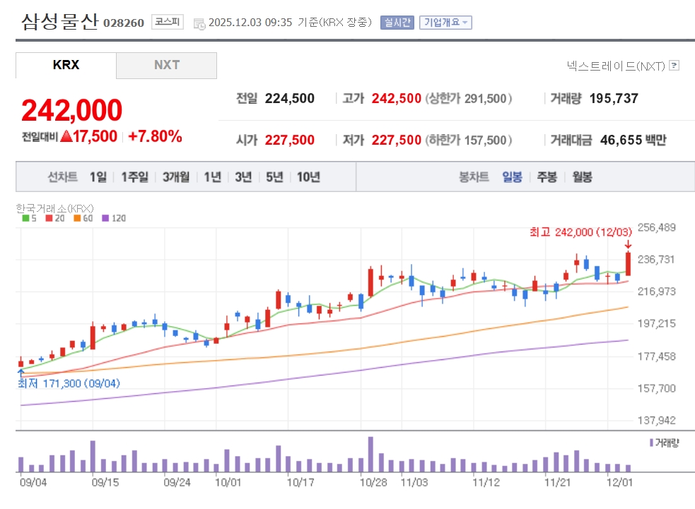 이미지 확대보기3일 한국거래소에 따르면 삼성물산은 오전 9시 35분 기준 전 거래일 대비 7.80% 오른 24만 2000원에 거래되고 있다. 삼성물산우 역시 5.61% 상승한 15만 7000원에 거래 중이다.
