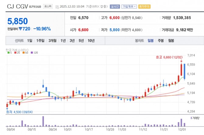 이미지 확대보기3일 한국거래소에 따르면 오전 10시 04분 기준 CJ CGV는 유가증권시장에서 전 거래일 대비 10.96% 하락한 5850원에 거래 중이다.