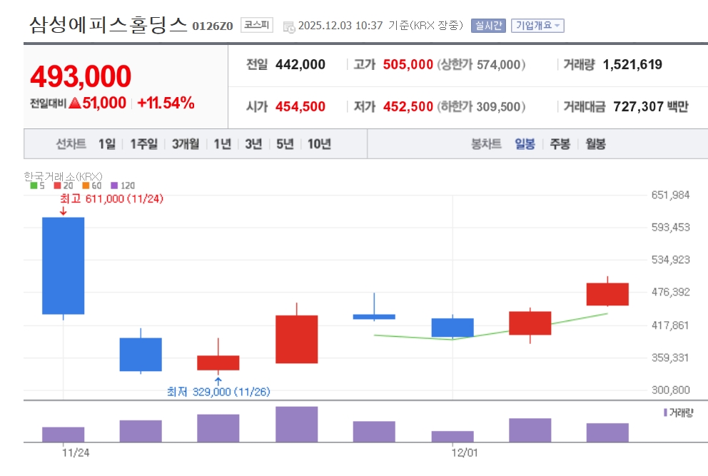 이미지 확대보기3일 한국거래소에 따르면 오전 10시37분 현재 삼성에피스홀딩스는 전일 대비 11.54% 오른 49만3000원을 기록 중이다. 장중 50만5000원까지 오르기도 했다.