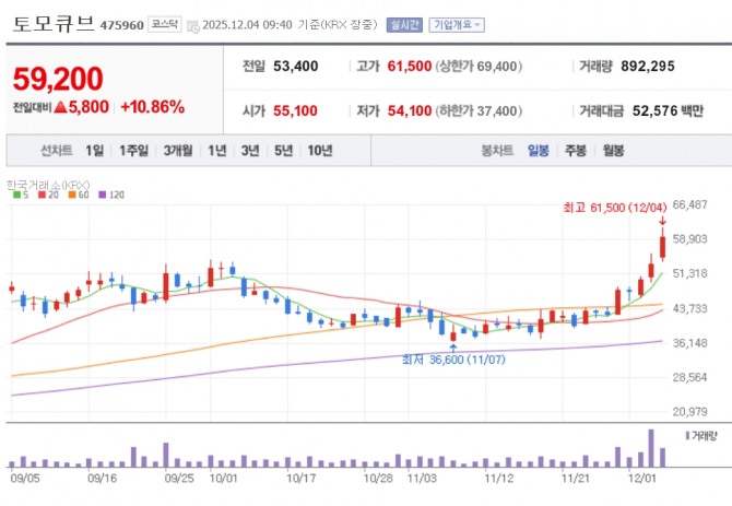 이미지 확대보기4일 한국거래소에 따르면 토모큐브는 이날 오전 9시 40분 현재 전 거래일 대비 10.86% 오른 5만 9200원에 거래되고 있다.
