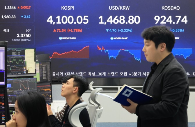 이미지 확대보기5일 한국거래소에 따르면, 코스피는 전 거래일 보다 1.78%(71.54포인트) 상승한 4100.05로 마감했다.