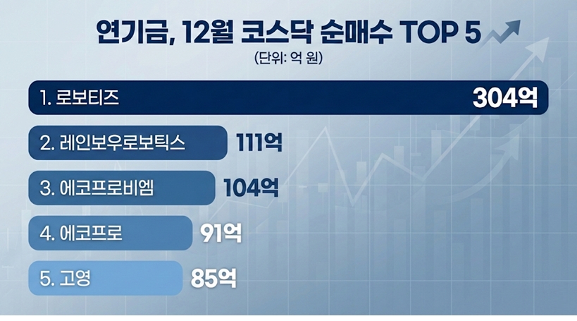 이가운데 연기금의 투자는 로봇주에 가장 집중됐다. 12월 1~5일 기준 순매수 1위는 로보티즈로 303억 8000만 원을 기록했고, 레인보우로보틱스가 110억 6000만 원으로 뒤를 이었다.