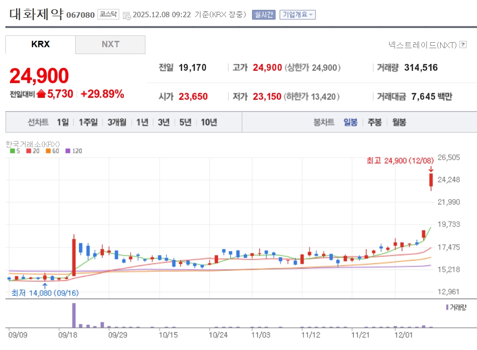 이미지 확대보기8일 한국거래소에 따르면 오전 9시 22분 현재 대화제약은 전 거래일보다 29.89% 오른 2만 4900원에 거래되고 있다.