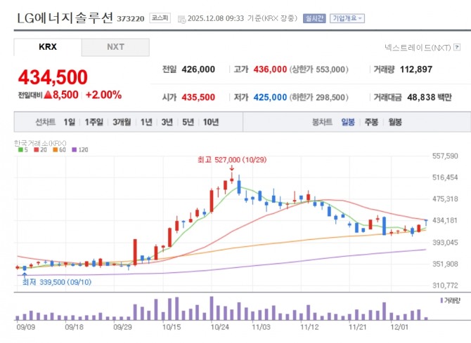 8일 엠피닥터에 따르면 LG에너지솔루션은 이날 오전 9시 33분 현재 전 거래일 대비 2.00% 오른 43만 4500원에 거래되고 있다.