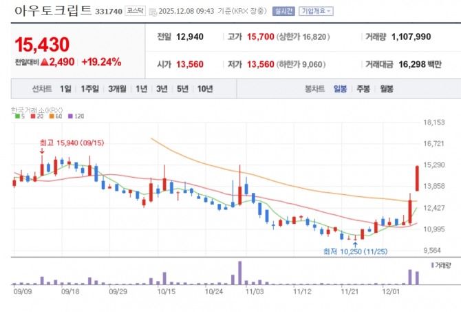 이미지 확대보기8일 한국거래소에 따르면 오전 9시 43분 현재 아우토크립트는 전 거래일보다 19.24% 오른 1만 5430원에 거래되고 있다.