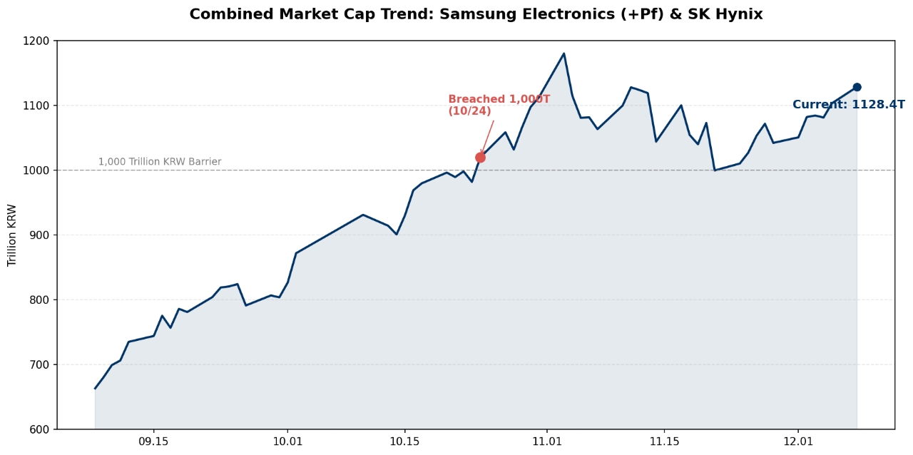 주목할 점은 이 같은 단기 강세보다 지난 3개월간 시총 흐름 자체가 '상승 사이클의 초입'임을 시사한다는 점이다. 9월 8일 663조원 수준이던 삼성전자·삼성전자우·SK하이닉스의 합산 시가총액은 AI 서버 투자와 메모리 가격 반등 전망이 강화되면서 가파르게 상승했다. 10월 중순에는 930조원을 넘었고, 10월 말에는 1110조원까지 치솟았다. 11월에 한 차례 조정이 있었으나 다시 반등해 12월 8일 현재 시총은 1128조원에 달한다. 3개월간 무려 465조원이 증가한 것으로, 시장이 2026년 업황을 선반영하고 있다는 해석이 나온다.