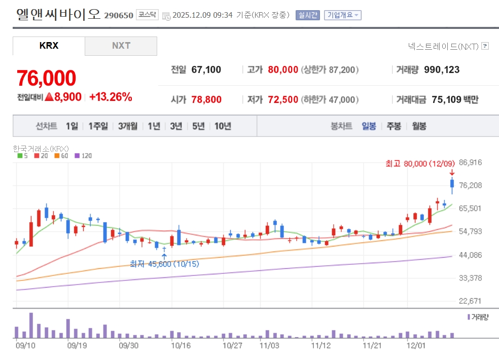 이미지 확대보기9일 한국거래소에 따르면 오전 9시 34분 기준 엘앤씨바이오는 코스닥시장에서 전 거래일 대비 13.26% 오른 7만6000원에 거래되고 있다.