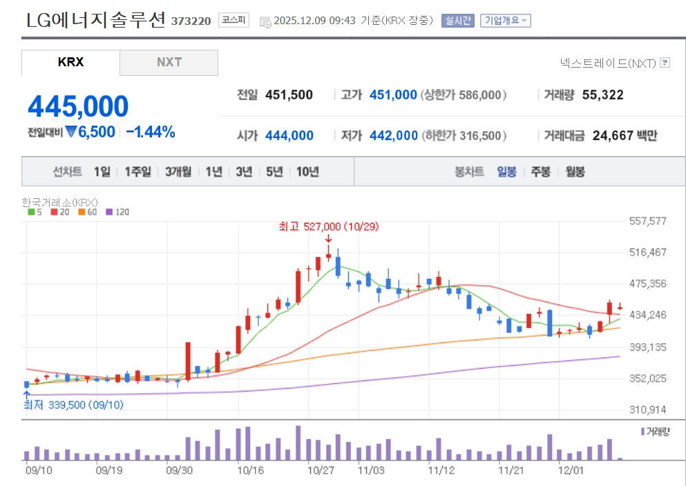 이미지 확대보기9일 한국거래소에 따르면 오전 9시 43분 현재 LG에너지솔루션은 전 거래일보다 1.44% 내린 44만5000원에 거래중이다. 삼성SDI(-2.23%), 에코프로(-2.72%), 에코프로비엠(-1.38%), 포스코퓨처엠(-1.72%) 등도 줄줄이 하락세다.