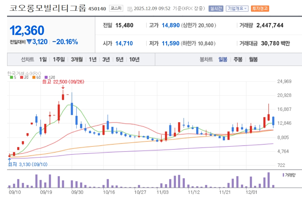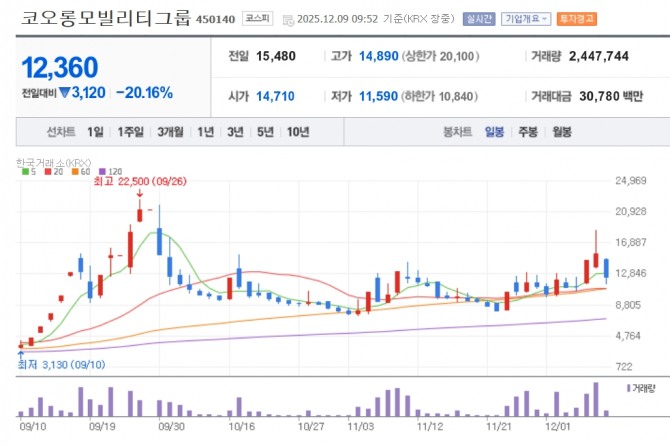 이미지 확대보기9일 한국거래소에 따르면 오전 9시 52분 기준 유가증권시장에서 코오롱모빌리티그룹은 전 거래일 대비 20.16% 하락한 1만2360원에 거래되고 있다. 장중에는 전 거래일 대비 3890원(25.1%) 하락한 1만1590원에 거래되기도 했다.