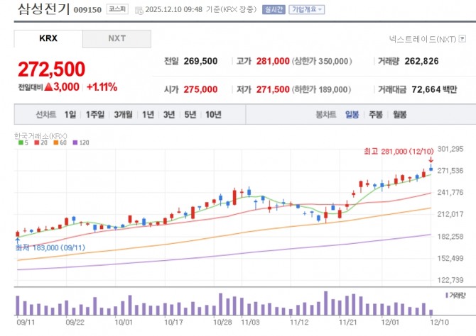 이미지 확대보기10일 한국거래소에 따르면 오전 9시 48분 현재 삼성전기는 전 거래일보다 1.11% 오른 27만 2500원에 거래되고 있다. 장중 28만 1000원까지 치솟아 52주 신고가를 경신했다.