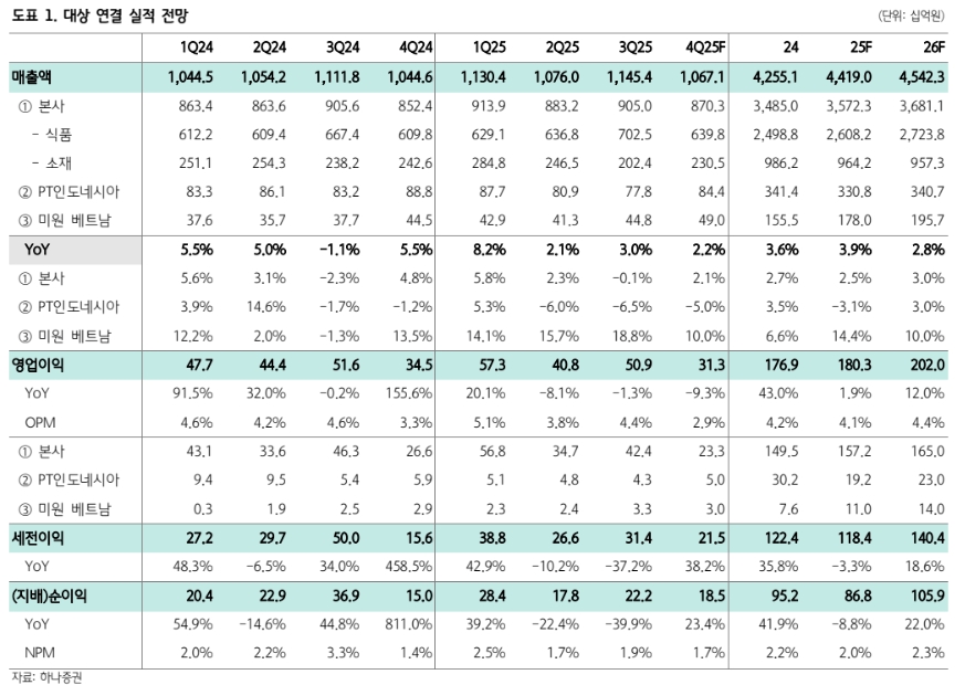 심은주 하나증권 연구원은 “상반기 실적 개선을 이끈 라이신이 시황 악화 영향으로 부진했다”면서 “식품(가공+B2B) 부문 매출은 전년 대비 5.3% 증가했지만, 대상네트웍스 축육사업 양수 효과를 제외하면 전년 수준에 그쳤다”다고 짚었다.