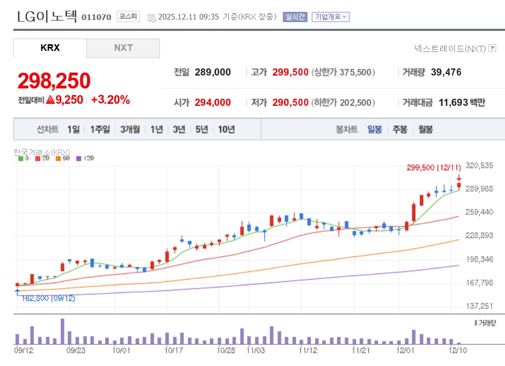 이미지 확대보기11일 한국거래소에 따르면 오전 9시 35분 기준 유가증권시장에서 LG이노텍은 전 거래일 대비 3.20% 오른 29만8250원에 거래되고 있다.