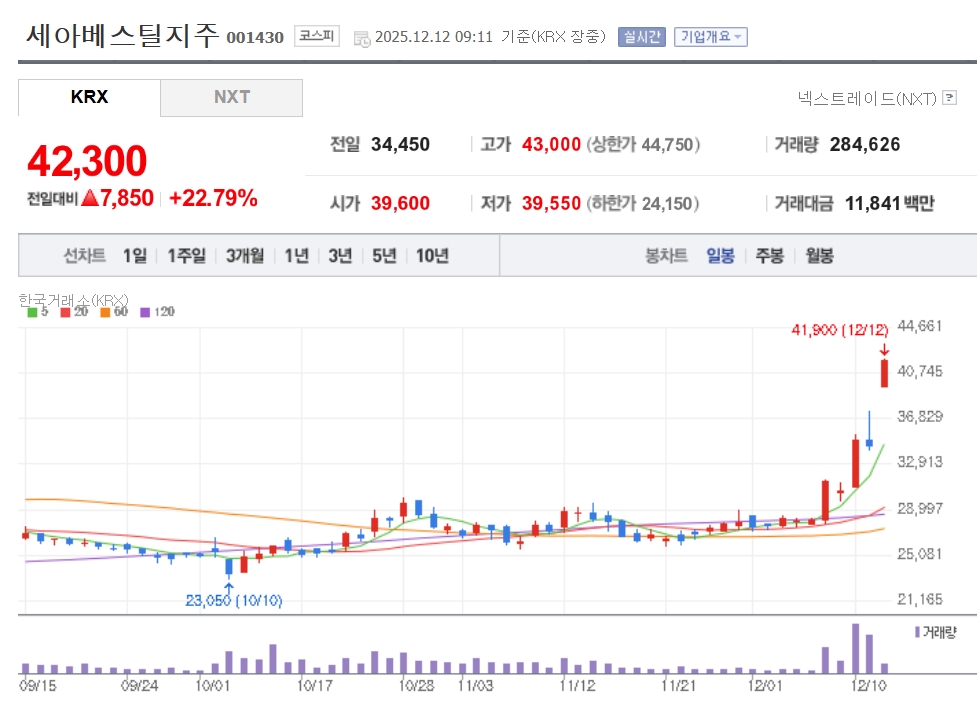 이미지 확대보기12일 한국거래소에 따르면 이날 오전 9시11분 현재 세아베스틸지주는 전거래일 대비 22.79% 오른 4만2300원에 거래 중이다. 장중 전장 대비 24.82% 오른 4만3000원까지 오르면서 사상 최고가를 기록하기도 했다.