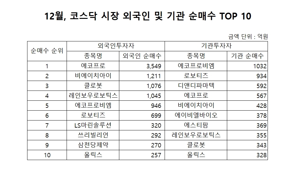 이미지 확대보기12일 한국거래소에 따르면 12월 1~12일 외국인 순매수 1위는 에코프로(3549억원)로 나타났다. 외국인은 2차전지 대장주 매집에 자금을 집중하며 코스닥 수급을 주도했다. 에코프로비엠(946억원)도 5위에 올라 2차전지 업종에 대한 외국인의 선호가 뚜렷했다.