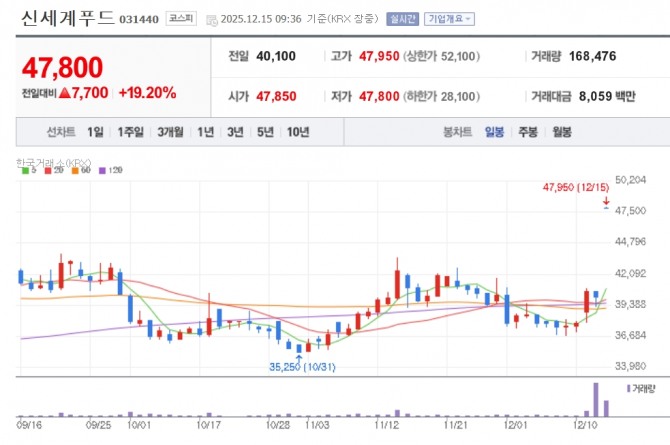이미지 확대보기15일 한국거래소에 따르면 이날 오전 9시 36분 기준 신세계푸드는 전 거래일 대비 19.20% 오른 4만 7800원에 거래되고 있다. 장중 한때 4만 7950원까지 오르며 52주 신고가를 경신했다.
