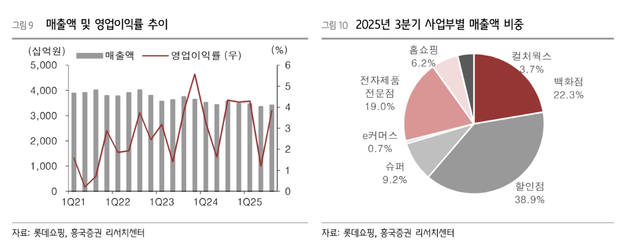 실적 개선의 근거로 4분기 실적 회복과 사업 부문별 구조 개선을 꼽았다. 박 연구원은 "롯데쇼핑의 올해 4분기 연결 기준 매출액은 3조 5000억원으로 전년 동기 대비 1.0% 증가하고, 영업이익은 2355억원으로 60% 급증해 지난 2~3분기 부진을 만회할 것"이라며 "지난해 4분기 낮은 기저 효과에 더해 사업 부문별로 백화점의 고마진 패션 상품 판매가 안정적으로 성장하고 외국인 매출 증가세가 이어진 점이 실적 개선을 이끌 것"이라고 부연했다.