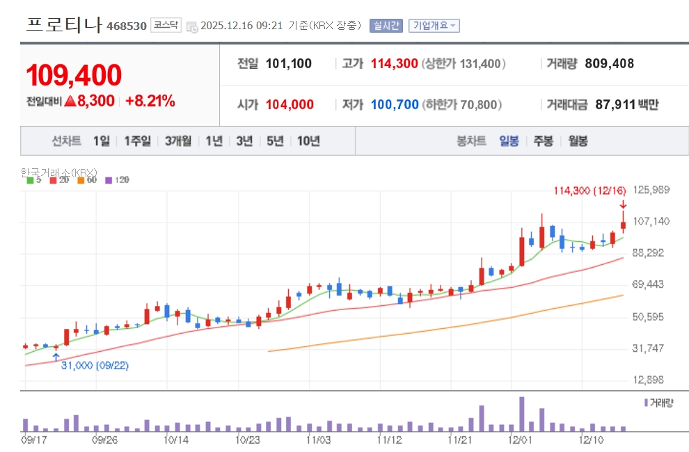 이미지 확대보기16일 한국거래소에 따르면 프로티나는 8.21% 오른 10만9400원에 거래 중이다. 전일 신고가 경신에 이어, 장초반 13%대까지 상승폭을 확대하기도 했다.