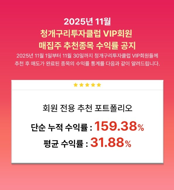 이미지 확대보기18년차 투자정보회사 청개구리투자클럽은 2025년 11월 VIP 회원 대상 제공 종목의 성과현황을 홈페이지를 통해 공개했다고 16일 밝혔다.