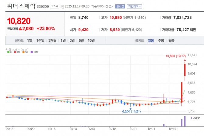 이미지 확대보기17일 한국거래소에 따르며 이날 오전 9시 17분 기준 탈모 치료 주사제를 개발하는 위더스제약은 전장 대비 23.80% 오른 1만820원에 거래 중이다. 탈모·헤어케어 브랜드 TS트릴리온은 전 거래일 대비 18.32% 급등했다.