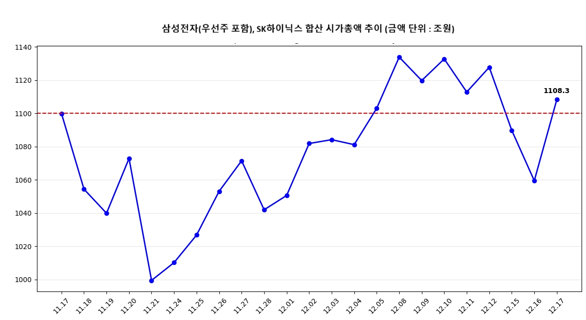 이들 종목의 합산 시총은 지난 12월 5일 처음 1100조 원을 돌파한 뒤 8일 1133.9조 원까지 정점을 찍었다. 이후 차익 실현 매물에 밀려 전날 1050조 원대로 후퇴했으나, 하루 만에 재반등하며 반도체 대장주의 저력을 재확인시켰다.