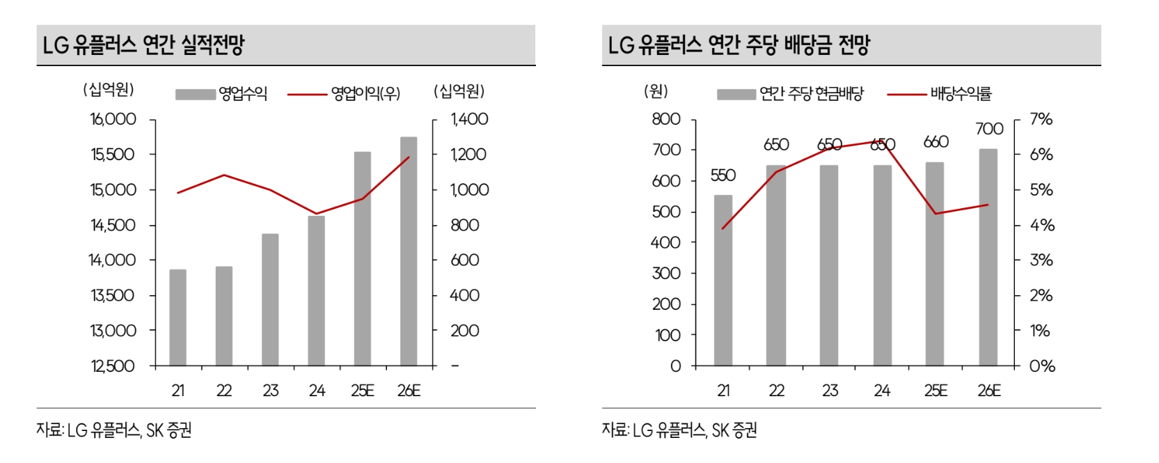 이미지 확대보기최 연구원은 “2025년 예상 영업이익은 9503억원(+10.1%)으로 3Q25(3분기) 희망퇴직에 따른 일회성 비용 1500억원가량이 반영됐음에도 불구하고 3년만에 증가할 것으로 예상한다”며 “컨슈머모바일, 스마트홈 등 유무선 통신사업의 호조와 감가상각비 등 비용 안정화가 실적개선을 견인할 전망인 가운데 이익의 안정기에 접어들면서 내년에도 영업이익 성장세는 이어질 것으로 예상되고 주주환원 확대에 기대감도 유효하다”고 부연했다.