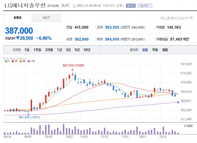 18일 한국거래소에 따르면 이날 오전 9시16분 현재 LG에너지솔루션은 전거래일 대비 6.82% 내린 38만7000원에 거래 중이다.