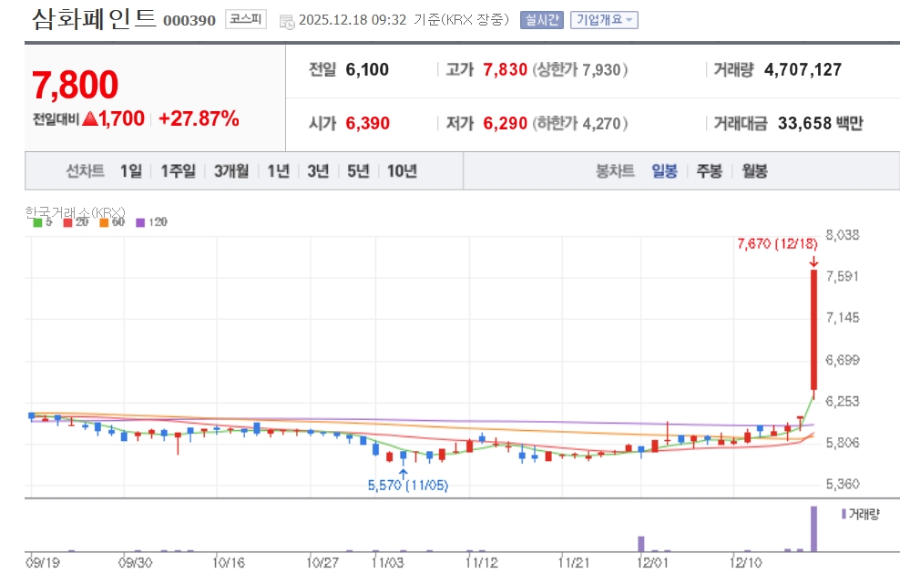이미지 확대보기18일 한국거래소에 따르면 이날 오전 9시 32분 기준 삼화페인트는 전날 종가에 비해 27.87% 오른 7800원에 거래되고 있다.