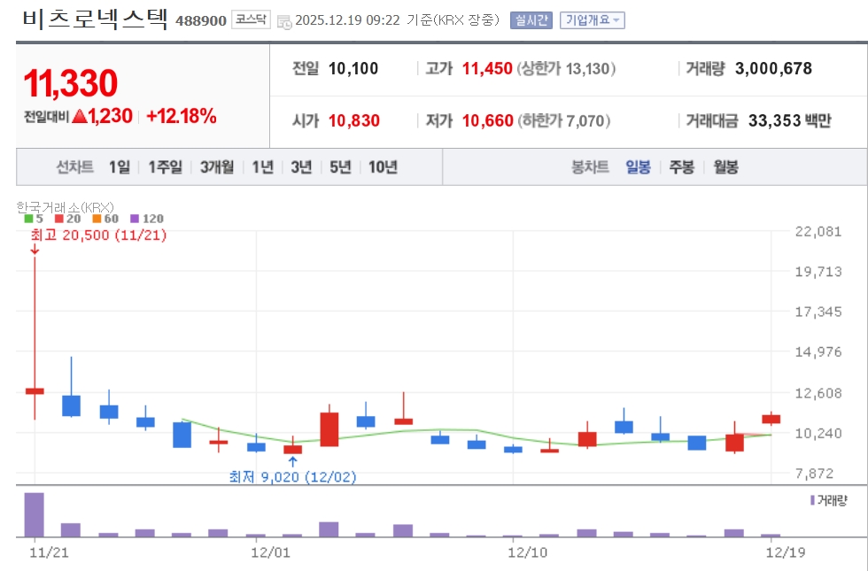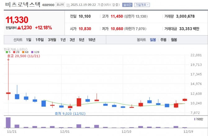19일 한국거래소에 따르면 비츠로넥스텍은 9시22분 기준 12.18% 오른 1만1330원에 거래 중이다.