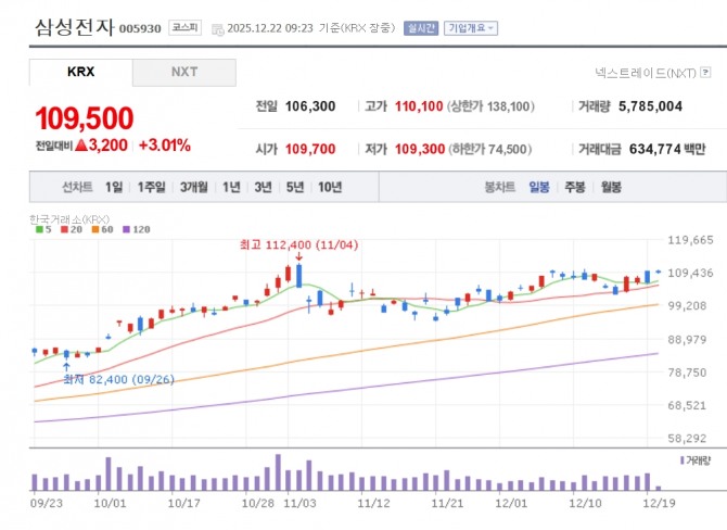 이미지 확대보기22일 한국거래소에 따르면 이날 오전 9시 23분 현재 삼성전자는 전 거래일 대비 3.01% 오른 10만9500원에 거래되고 있다. SK하이닉스는 4.94% 급등한 57만4000원을 기록 중이다.