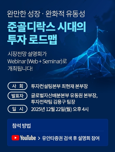 이미지 확대보기이번 설명회는 글로벌 금융시장이 급등 이후 조정 국면에 접어든 가운데, 향후 시장 환경 변화에 대응할 투자 방향을 정리하기 위해 마련했다. 온라인 웨비나 방식으로 진행되며, 별도의 사전 신청 없이 유튜브에서 ‘유안타증권’을 검색하면 누구나 무료로 시청할 수 있다.