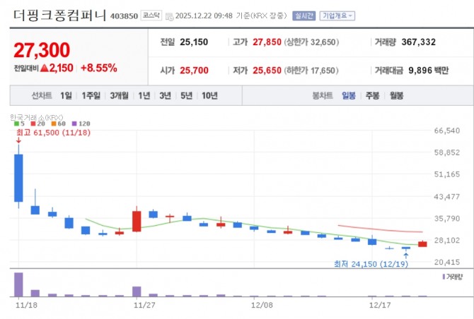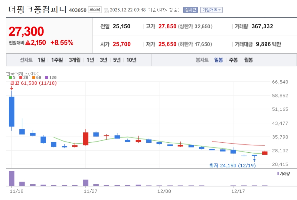 이미지 확대보기22일 한국거래소에 따르면 더핑크퐁컴퍼니는 이날 오전 9시 38분 현재 전 거래일 대비 2150원(8.55%) 오른 2만 7300원에 거래되고 있다.