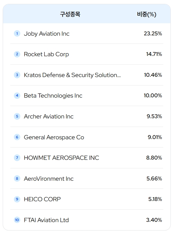 이와 함께 미국 정부의 지원이 기대되는 드론 기업과 항공 서비스 기업에도 고루 투자한다. 무인기 업체 크라토스(Kratos), 에어로바이런먼트(AeroVironment)를 비롯해 GE 에어로스페이스(GE Aerospace), FTAI 애비에이션(FTAI Aviation) 등 항공 모빌리티 생태계 전반의 핵심 기업을 편입했다.
